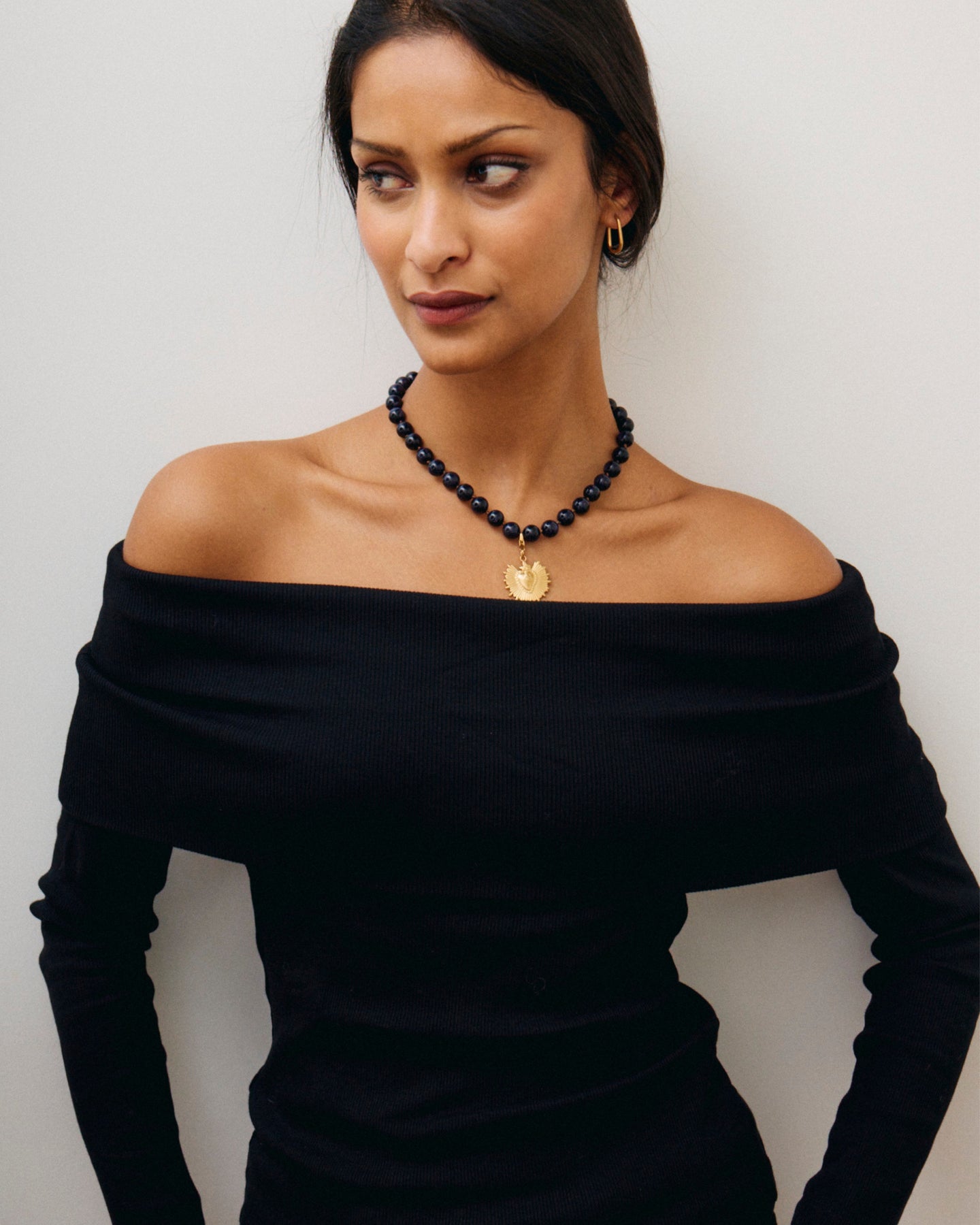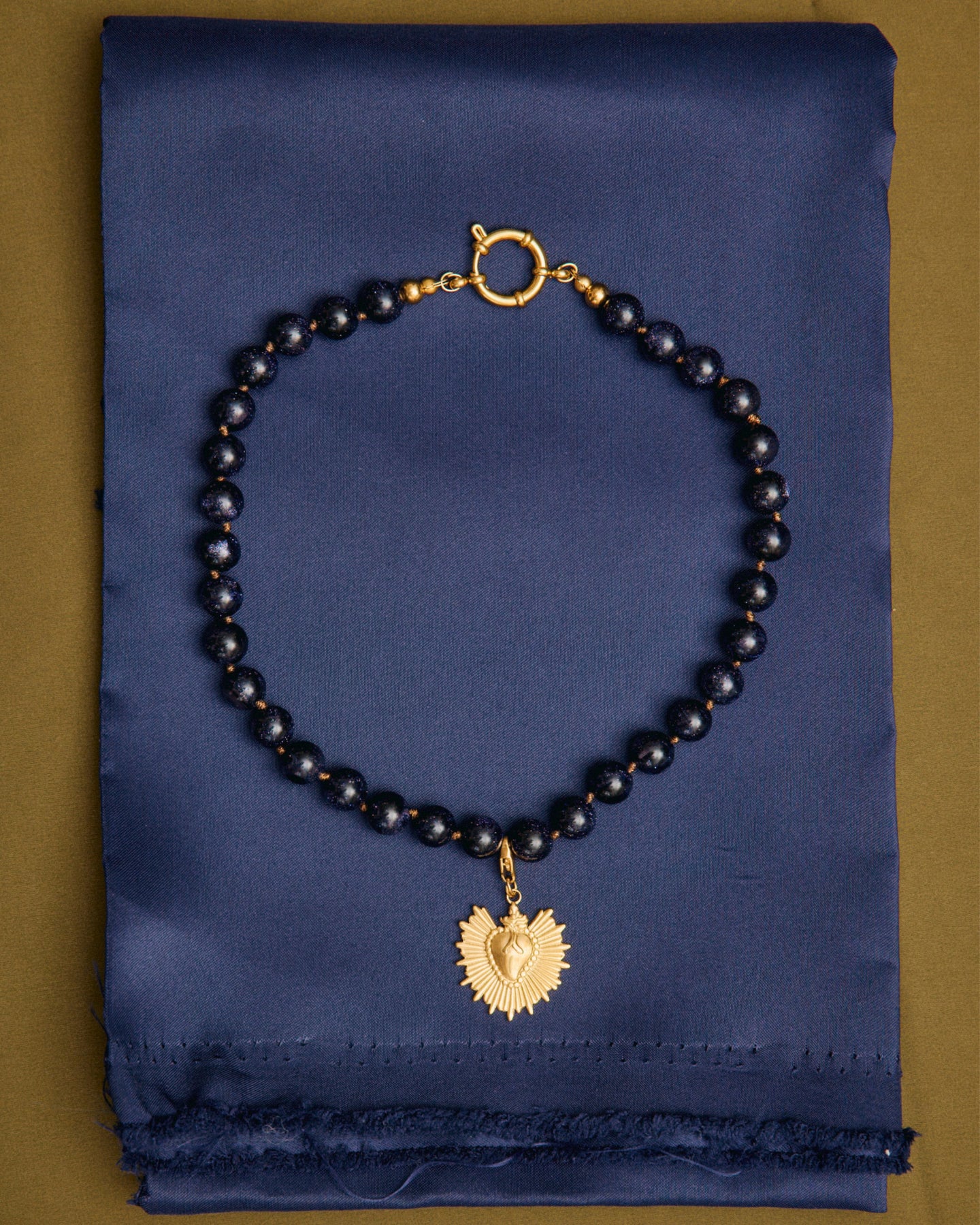 Un collier inspiré par l’ainée des neufs Muses, celle de la poésie. Il allie la profondeur des pierres d’étoiles et les symboles d’un charm ex-voto.